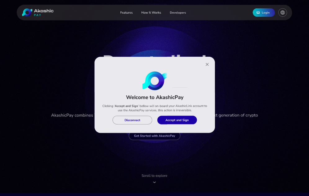 3. Click "Accept and Sign" on the new prompt. This action will onboard your AkashicLink account for AkashicPay services, and the new fees associated with this account will also be applied.<br>