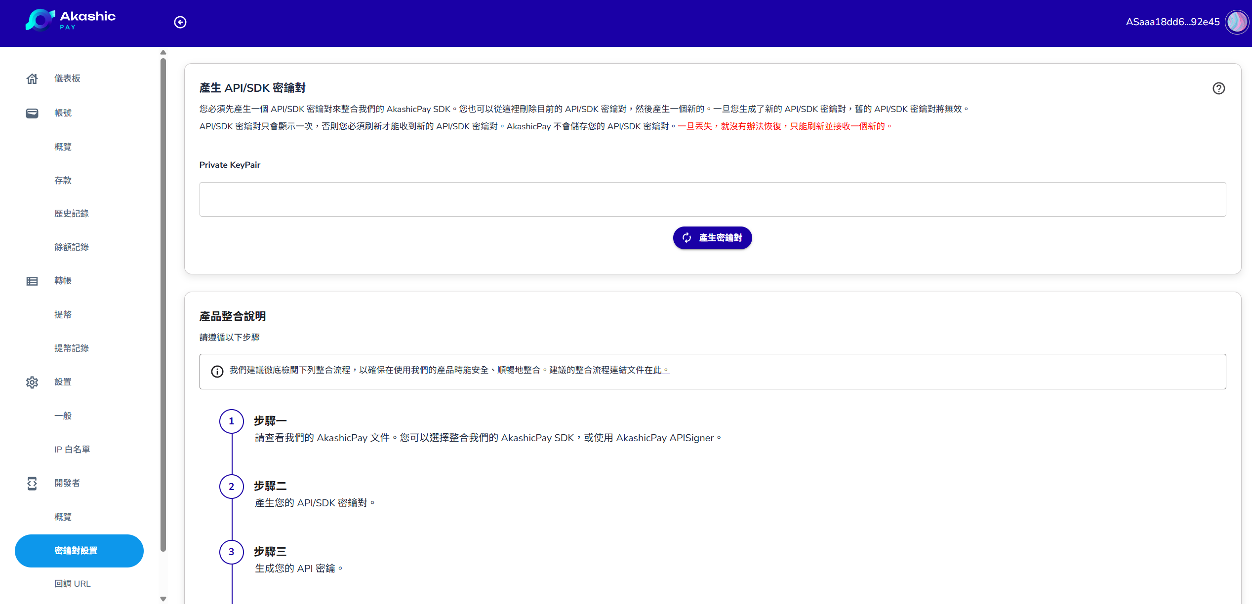 * 當您第一次加入 AkashicPay 時，您應該已經生成了您的第一個 API/SDK 密鑰對。