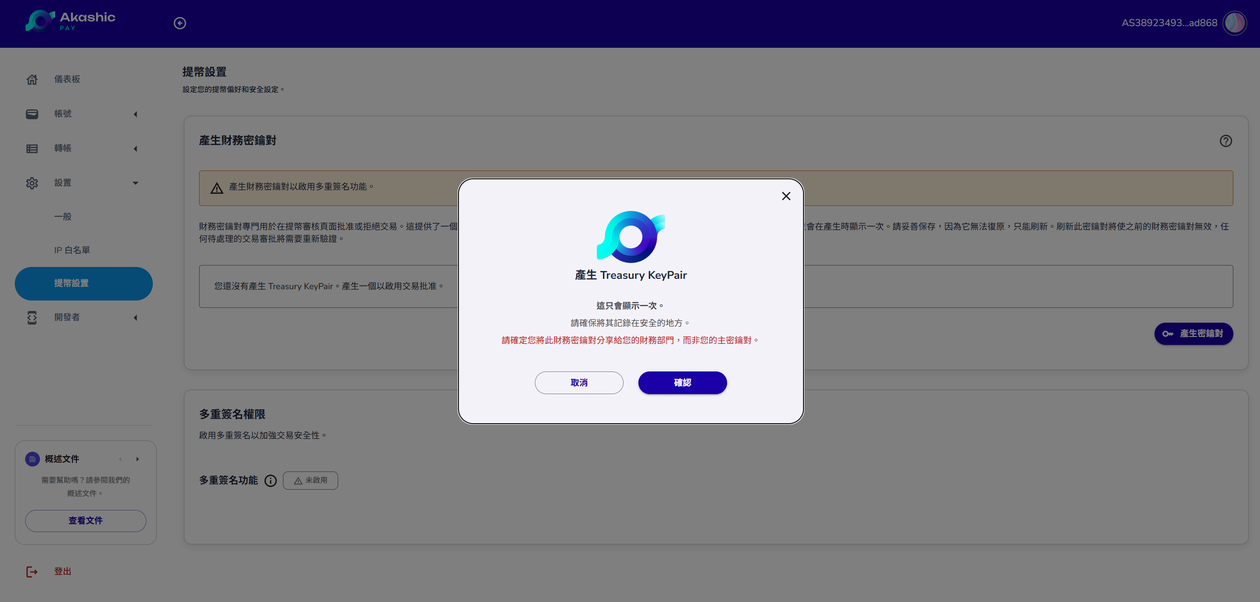 在 「提幣設置 」中，您可以通過生成您的財務密鑰對來啟用多重簽名功能，為通過您的 API/SDK 密鑰對交易啟動的提款提供額外的安全層。此功能可作為第二重保障，確保在批准或拒絕提款時，需要使用財務密鑰對進行額外的驗證步驟，以加強對您 AkashicPay 賬號中資金的保護。