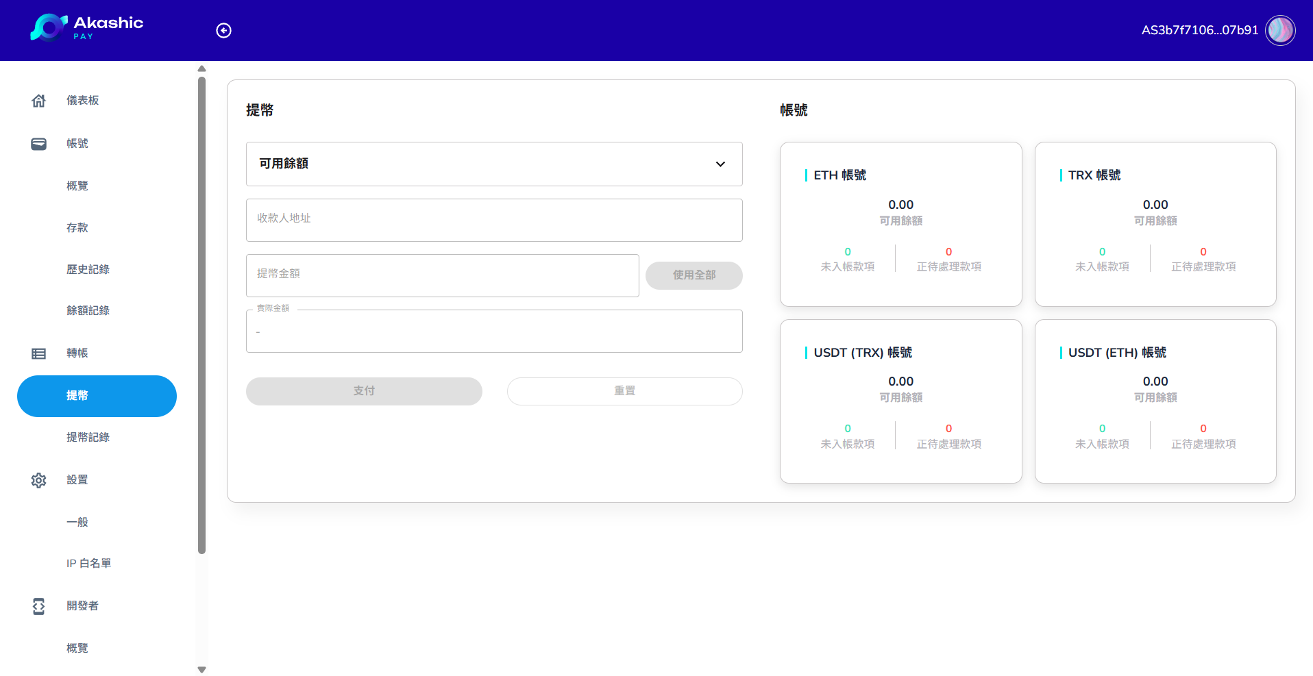 支付功能允許您從您的 AkashicPay 帳號向外部地址啟動提款。如果您打算提款，請瀏覽到支付頁面，並按照以下步驟操作：